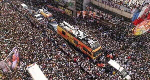 तमिलनाडु के करूर में शनिवार को सुपरस्टार और तमिलगा वेट्री कजगम (TVK) के प्रमुख विजय की रैली दौरान एक दर्दनाक हादसा हुआ। भारी भीड़ जमा होने के कारण कई लोग बेहोश होकर गिर पड़े और भगदड़ मच गई। हालात बिगड़ते देख एक्टर विजय को अपना भाषण रोकना पड़ा।