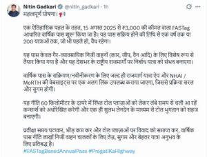 नितिन गडकरी ने जानकारी दी कि यह वार्षिक पास 15 अगस्त 2025 से पूरे देश में लागू होगा। इसके बाद FASTag धारक टोल प्लाजा पर कैशलेस और तेज यात्रा का आनंद ले सकेंगे, साथ ही उन्हें हर यात्रा पर टोल कटौती की चिंता नहीं रहेगी।