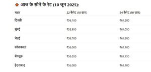 सोने-चांदी की कीमतों में हर दिन बदलाव देखने को मिलता है, और आज 10 जून 2025 को भी देशभर के प्रमुख शहरों में भावों में उतार-चढ़ाव देखने को मिला है। शादी-विवाह के सीजन और वैश्विक बाज़ार के असर के चलते निवेशकों और ग्राहकों की नजरें इनकी दरों पर टिकी हुई हैं। आइए जानें आज आपके शहर में 22 कैरेट और 24 कैरेट सोने की कीमत क्या है: