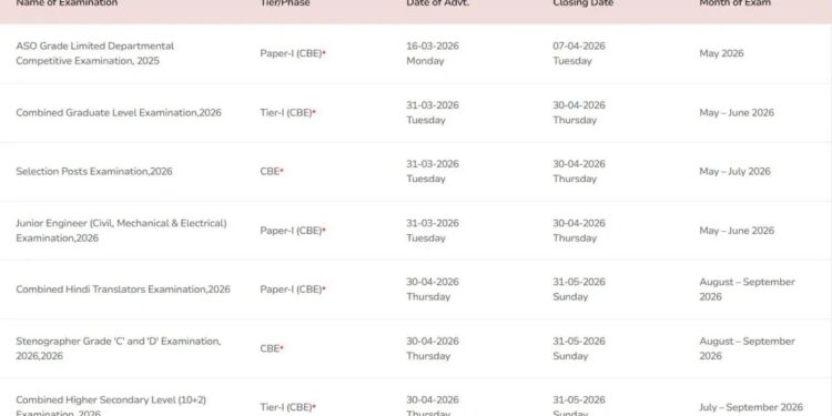 कंबाइंड ग्रेजुएट लेवल (CGL) 2026 के लिए नोटिफिकेशन 31 मार्च 2026 को जारी किया जाएगा। आवेदन प्रक्रिया 30 अप्रैल 2026 तक चलेगी। वहीं Tier-1 परीक्षा का आयोजन मई से जून 2026 के बीच किया जाएगा। यह परीक्षा SSC की सबसे बड़ी भर्ती प्रक्रियाओं में से एक मानी जाती है।